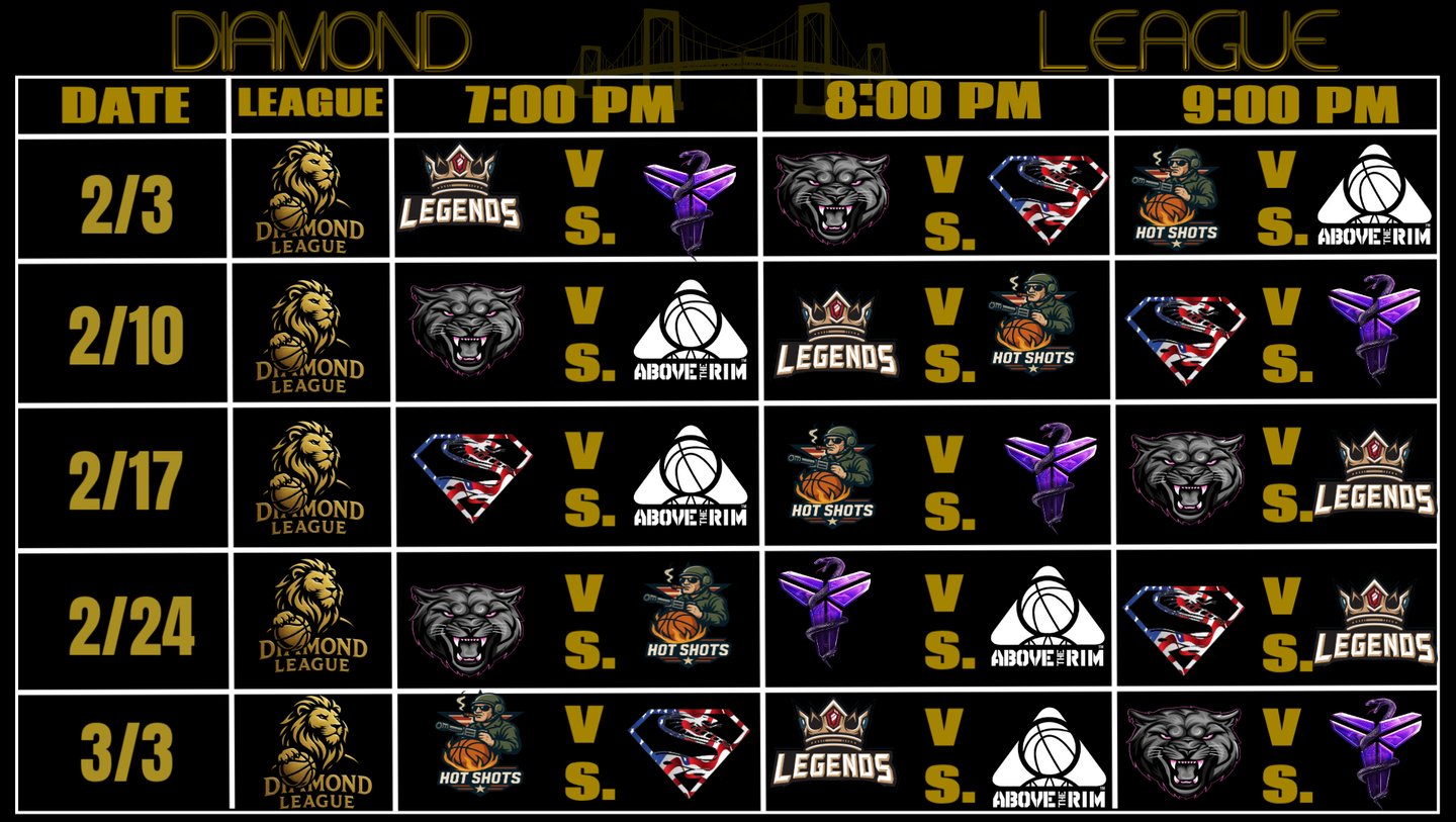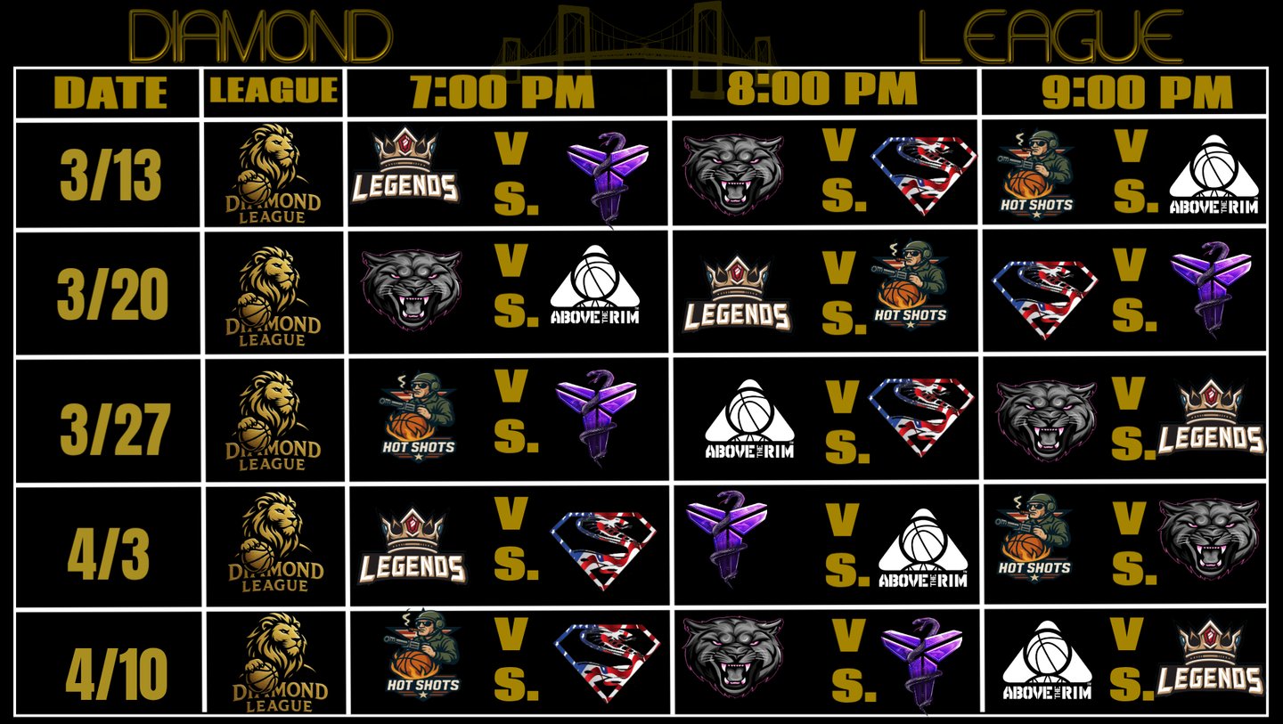 A league established in 2019 & built upon a foundation of veteran experience. This six team league combines a physical style of play with high court I.Q. The Diamond League is high octane competition at it's best. Players are 35 years of age & older with a median age of 40. Gameplay is dictated by modified NBA rules with 22 minute halves.
